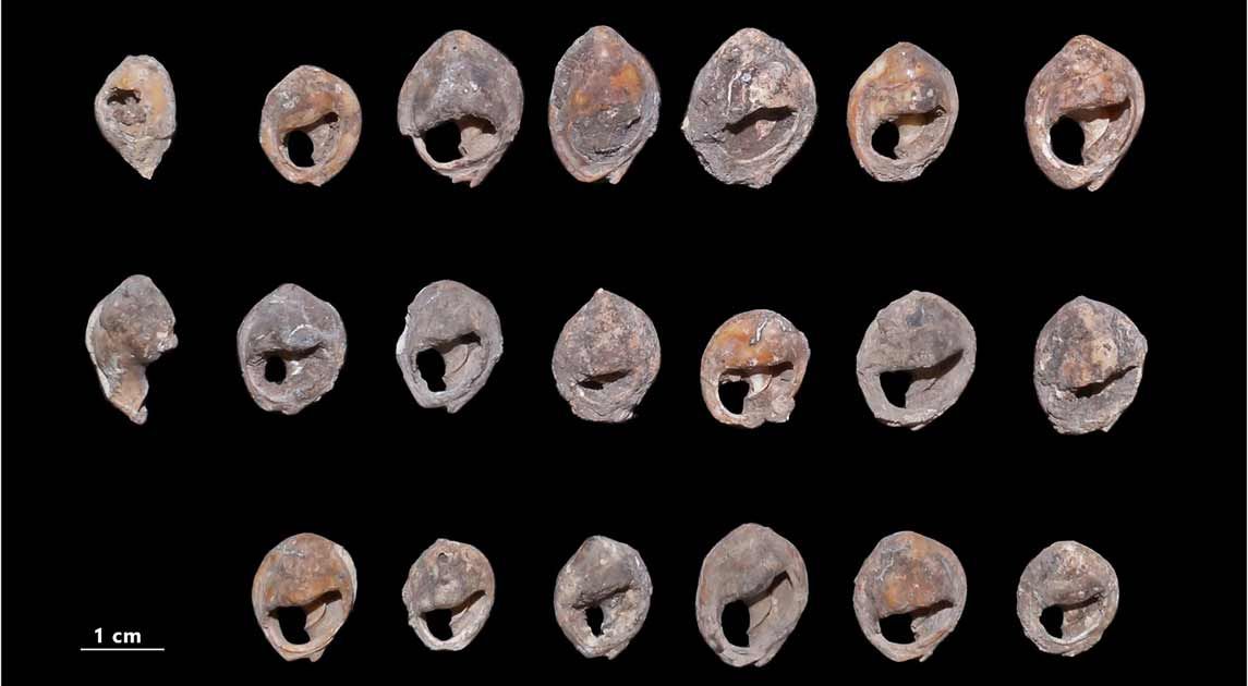 Para arkeolog menemukan 33 manik-manik kecil yang terbuat dari cangkang laut. Setiap manik memiliki lubang kecil yang jelas dibuat oleh tangan manusia untuk memungkinkan manik-manik itu dirangkai menjadi kalung, gelang, atau hiasan tubuh lainnya. Bentuk dan ukuran manik-manik menunjukkan bahwa benda-benda ini digunakan sebagai simbol identitas atau komunikasi sosial.